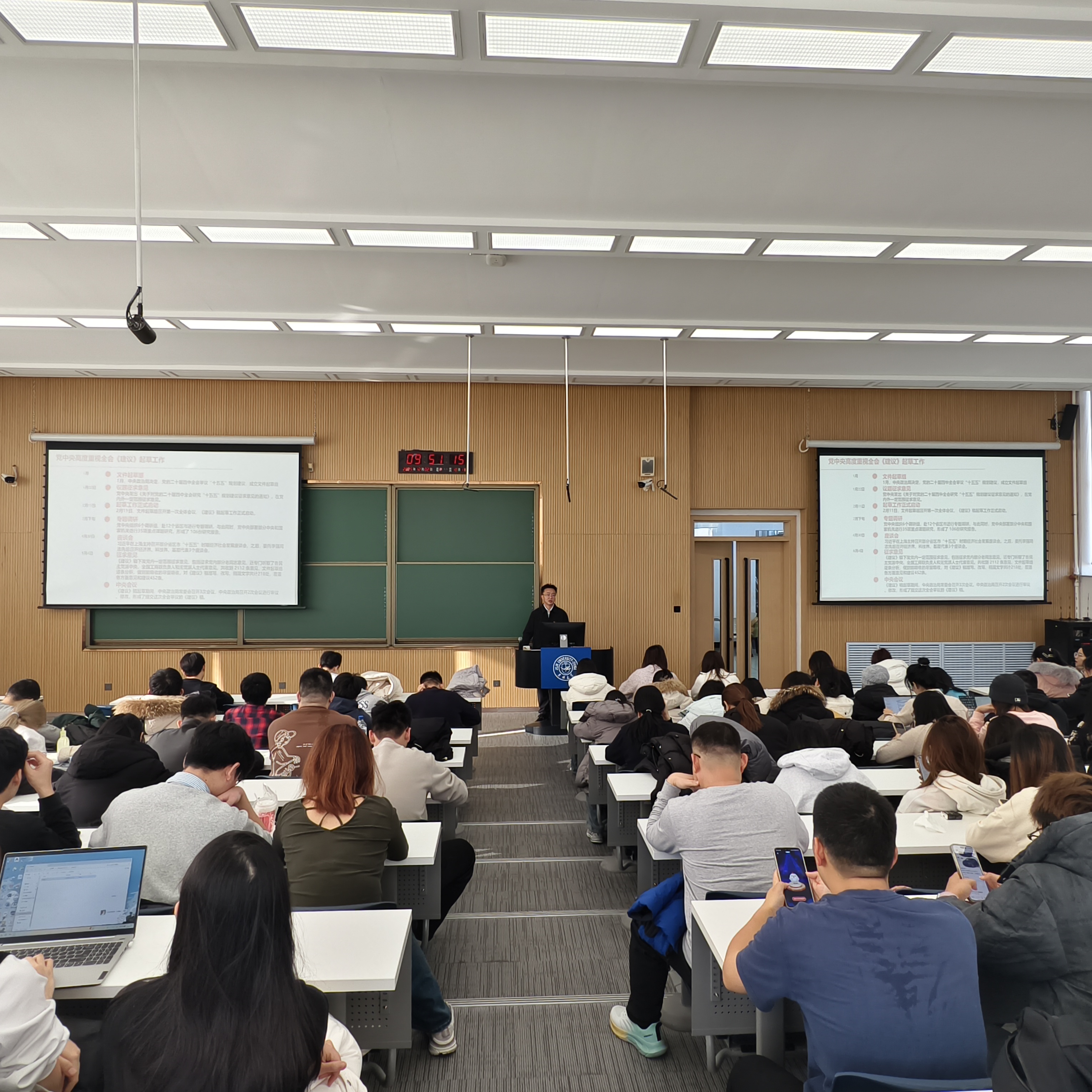 最后,张杨从“十四五”时期我国的发展成就、“十五五”时期的特殊地位,以及“十五五”时期经济社会发展的指导方针、主要目标、基本原则等方面向大家介绍了党的二十届四中全会的基本情况。张杨指出,实现现代化是近代以来中国人民梦寐以求的夙愿,实现中华民族伟大复兴是近代以来中华民族最伟大的梦想。现在历史的接力棒已经传递到我们手中,他号召同学们永葆家国情怀,完成好应尽的历史使命,以“功成不必在我,功成必定有我”的使命担当为建设社会主义现代化强国贡献力量。