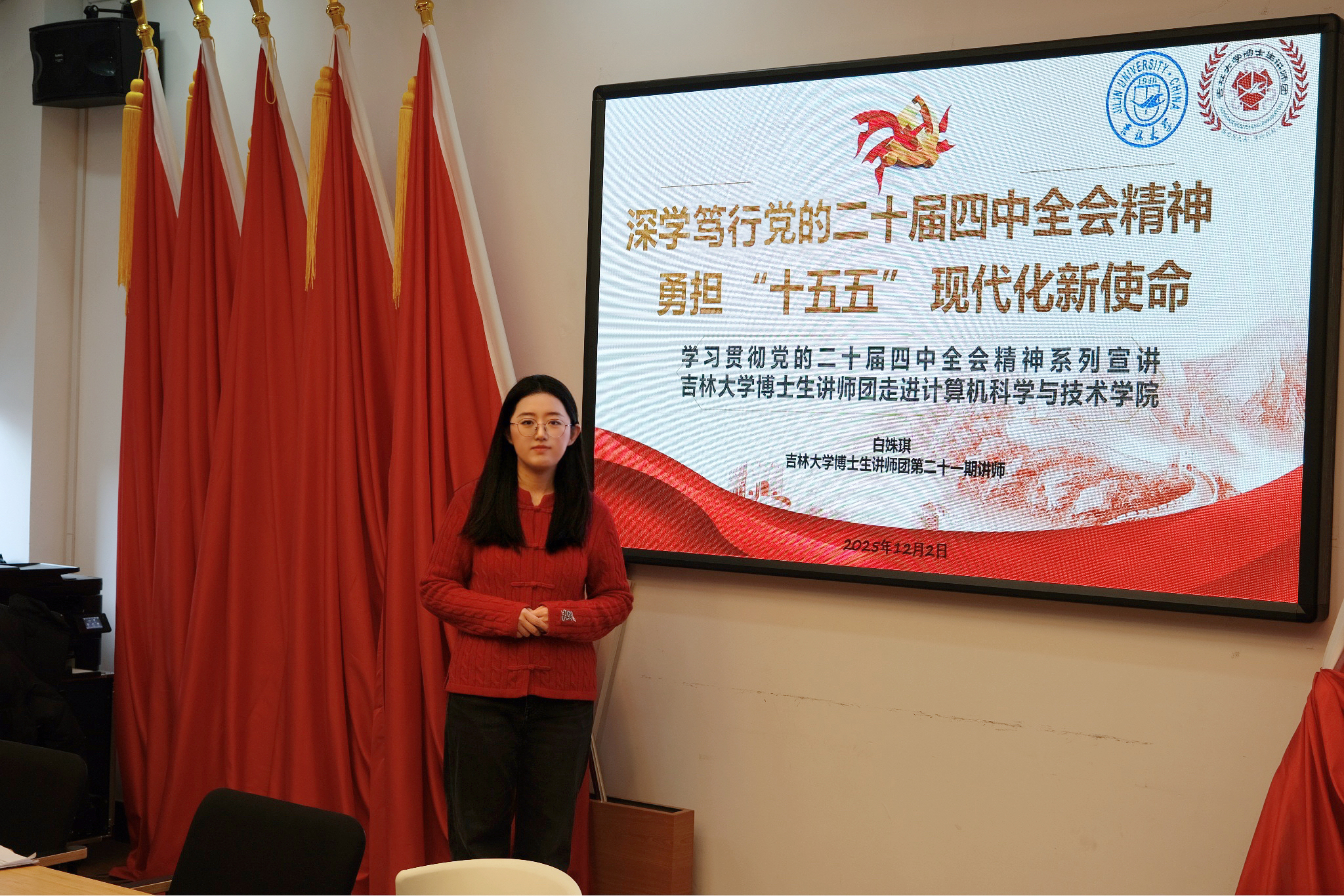 为深入学习贯彻党的二十届四中全会精神,吉林大学党委研究生工作部组织博士生讲师团走进校内各学院,开展党的二十届四中全会精神宣讲系列活动。12月2日,讲师白姝琪走进计算机科学与技术学院,在前卫南区王湘浩楼党员活动中心进行了宣讲,计算机科学与技术学院40余名研究生参与了本次活动。