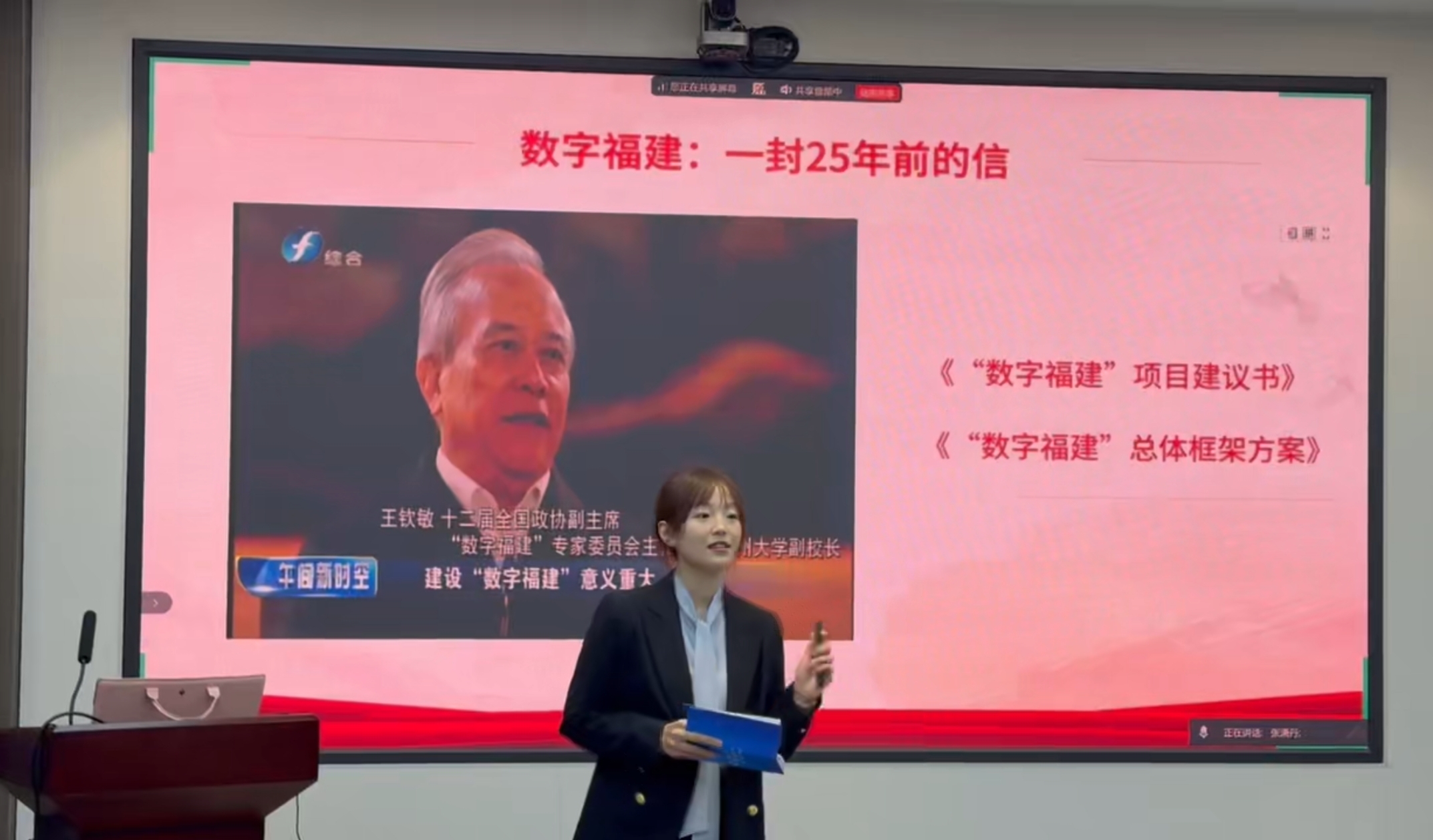卢慧颖以“数字中国:赋能中国式现代化新征程”为题,从数字中国的战略溯源、宏伟蓝图、“十四五”时期的坚实基础、“十五五”的前瞻与挑战以及共赴数字新程五个方面进行了系统宣讲。首先,她回顾了数字中国的起源,从“数字福建”的地方探索到国家战略的演进,体现了党对科技发展规律的深刻把握。其次,她解读了数字中国建设的“2522”整体框架,包括两大基础、两大能力、五位一体融合赋能和两大环境,阐述了数字技术如何服务于经济发展和民生改善。第三,她盘点了“十四五”时期数字中国在基础设施、技术创新、数实融合等方面取得的成就,特别强调了数字医疗、智慧教育等惠及民生的案例。第四,她展望了“十五五”时期人工智能时代的机遇与挑战,分析了核心技术“卡脖子”和数字鸿沟等问题。最后,她呼吁师生做数字时代的先行者、守护者、推动者和分享者,共同参与数字中国建设。宣讲中,卢慧颖还通过互动问答和生动案例,增强了内容的感染力和实效性。