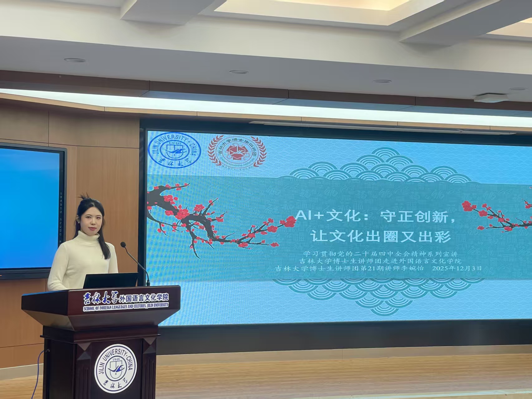 为深入学习贯彻党的二十届四中全会精神,吉林大学党委研究生工作部组织博士生讲师团走进校内各学院开展系列宣讲活动。12月3日,讲师李婉怡走进外国语言文化学院500会议室,以“AI+文化:守正创新,让文化出圈又出彩”为题开展宣讲,学院辅导员张若溪、林明帅参与本次活动。