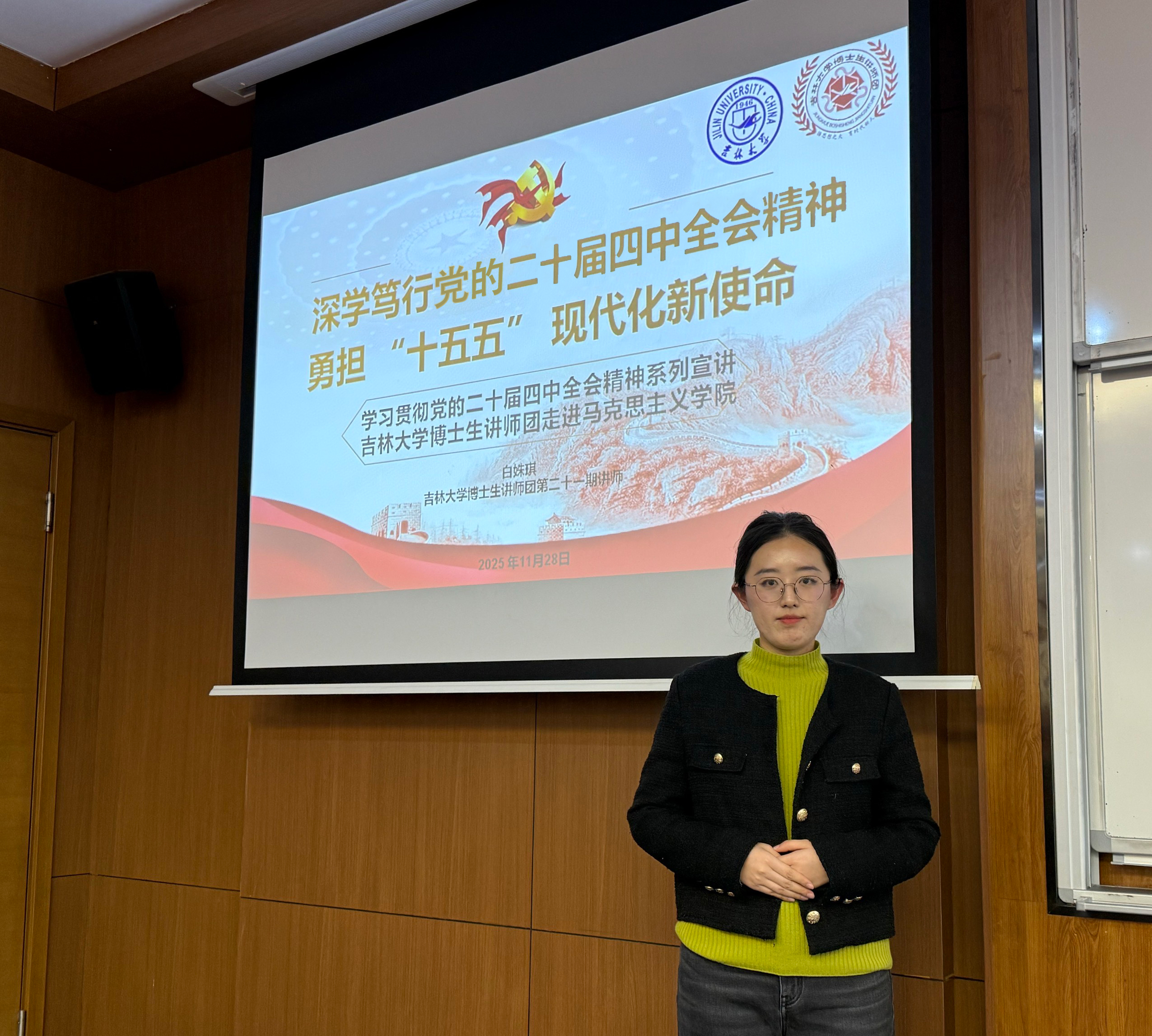 为深入学习贯彻党的二十届四中全会精神,吉林大学党委研究生工作部组织博士生讲师团走进校内各学院,开展党的二十届四中全会精神宣讲系列活动。11月28日,讲师白姝琪走进马克思主义学院在前卫南区逸夫楼第六阶梯进行了宣讲,马克思主义学院100余名研究生参与了本次活动。