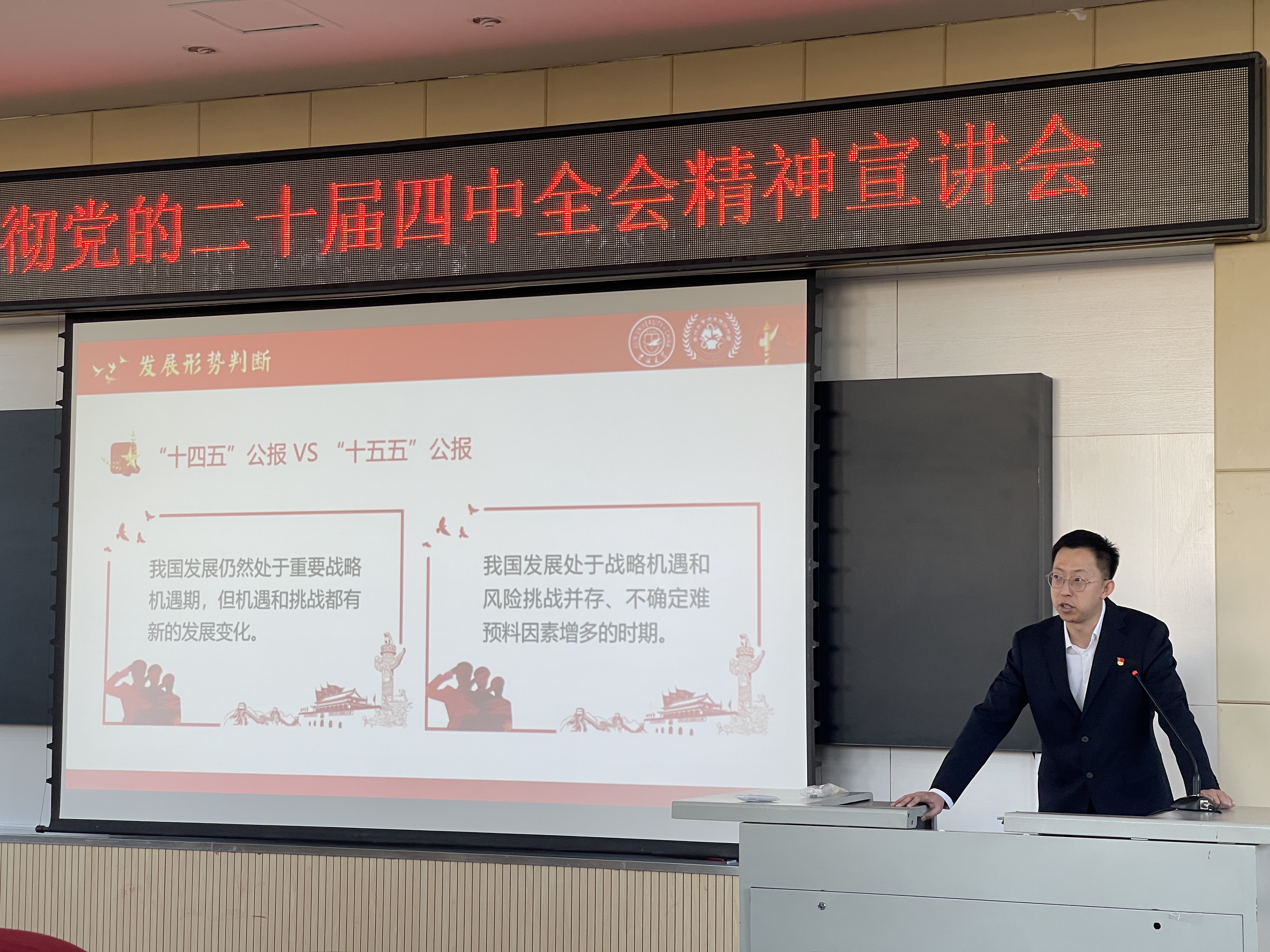 党的二十届四中全会是在即将进入基本实现社会主义现代化夯实基础、全面发力的关键时期召开的一次十分重要的会议,全会审议通过了《中共中央关于制定国民经济和社会发展第十五个五年规划的建议》,对未来五年发展作出顶层设计和战略擘画,是乘势而上、接续推进中国式现代化建设的又一次总动员、总部署。张书杭以“承上启下的关键五年——纵览‘十五五’规划”为主题展开宣讲,带领同学们全面了解了未来五年经济社会发展的七个主要目标和十二大战略任务,并重点讲解了“加快高水平科技自立自强”相关内容。