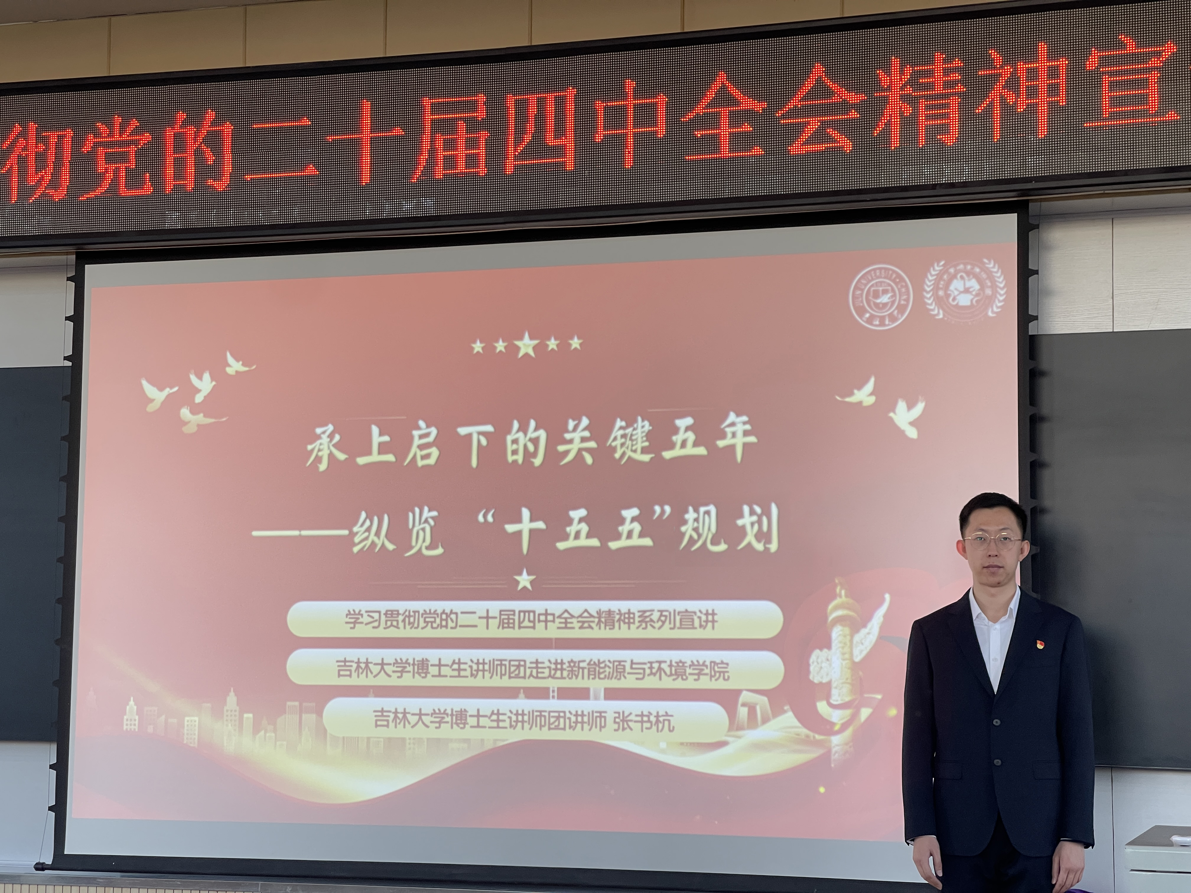为深入学习贯彻党的二十届四中全会精神,吉林大学党委研究生工作部组织博士生讲师团走进校内各学院,开展党的二十届四中全会精神宣讲系列活动。12月5日,讲师张书杭走进新能源与环境学院,在前卫北区理化楼第一阶梯教室进行了宣讲,新能源与环境学院学生代表参与了本次活动。