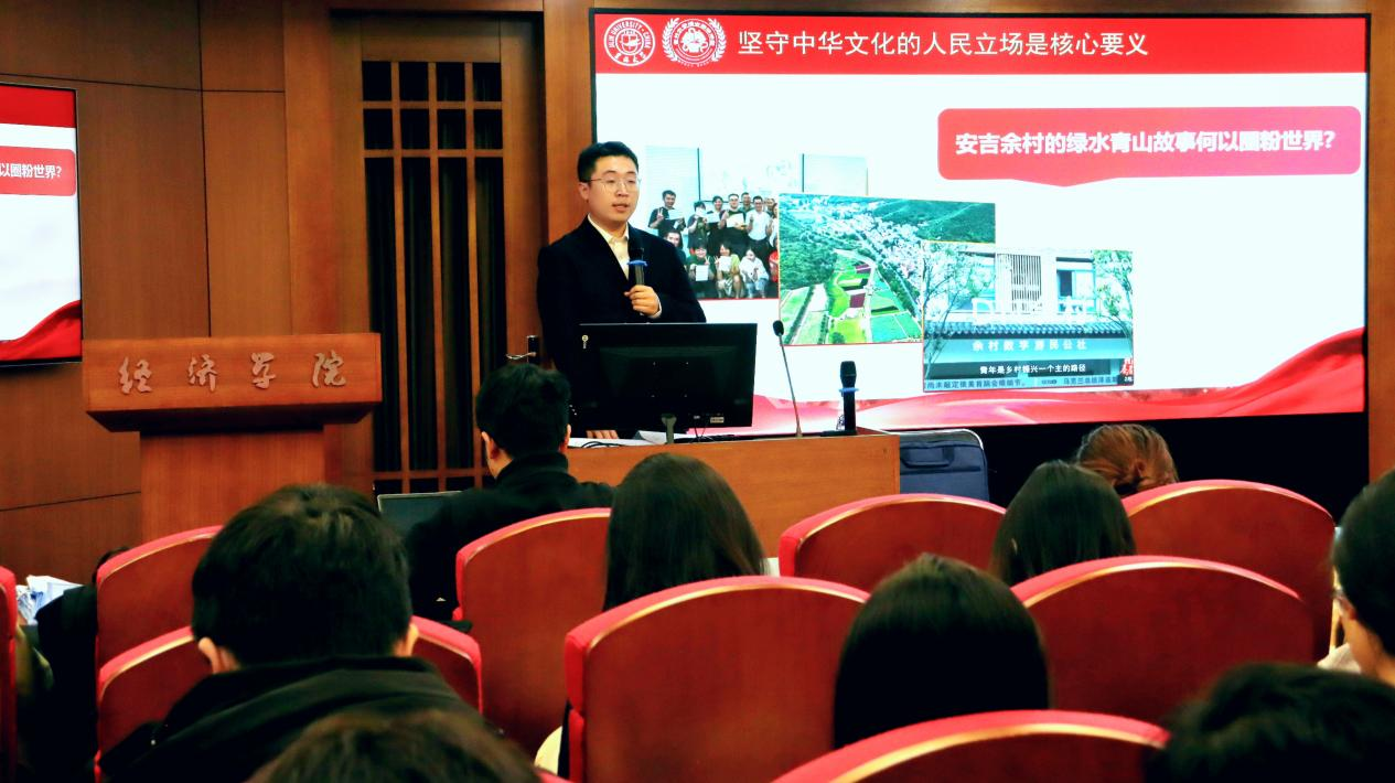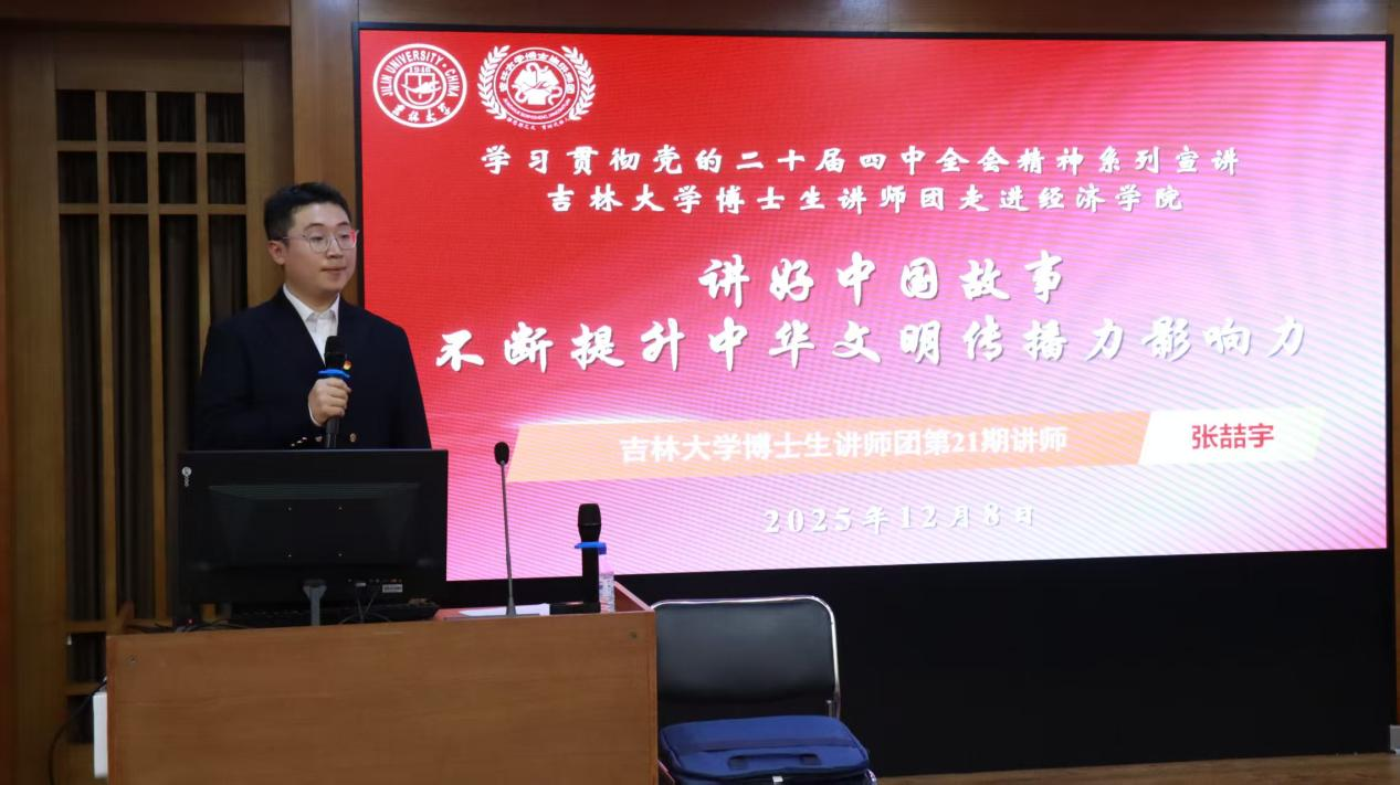 为深入学习贯彻党的二十届四中全会精神,吉林大学党委研究生工作部组织博士生讲师团走进校内各学院,开展党的二十届四中全会精神宣讲系列活动。12月8日,讲师张喆宇走进经济学院,在前卫南区东荣大厦804教室进行宣讲,经济学院50余名研究生代表参与了本次活动。