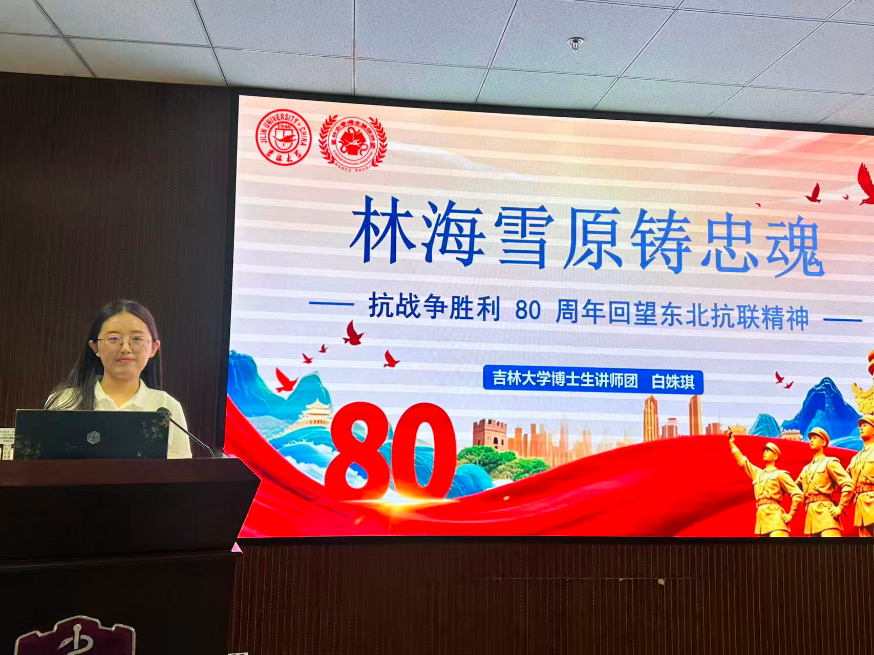 主题宣讲环节,吉林大学博士生讲师团讲师白姝琪围绕“林海雪原铸忠魂——抗战胜利80周年回望东北抗联精神”这一主题,讲述了东北抗联长达十四年艰苦卓绝的斗争,书写了中国抗日战争史上气贯长虹的英雄史诗。东北抗联精神作为中国共产党人精神谱系的重要组成部分,时至今日仍具有重大的历史意义和现实意义。在主题座谈环节,白姝琪分享了传承抗战精神的具体方法,包括寻访抗战遗址、制作历史短视频等创新形式,并就吉林大学博士生讲师团的宣讲经验进行介绍。