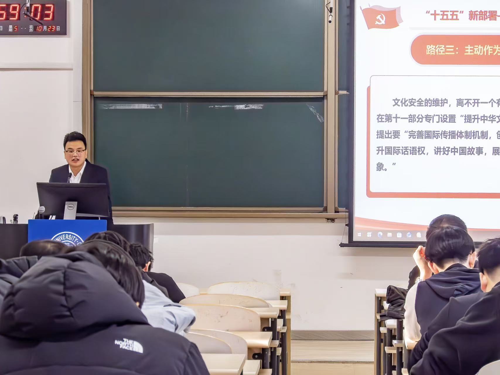郝永恒以“筑牢国家文化安全屏障,服务‘十五五’发展新格局”为题,结合自身专业背景,从文化视角系统解读了党的二十届四中全会提出的“坚持统筹发展与安全”的重要原则。宣讲中主要围绕文化安全的重要意义、战略路径与青年担当三个层面展开。