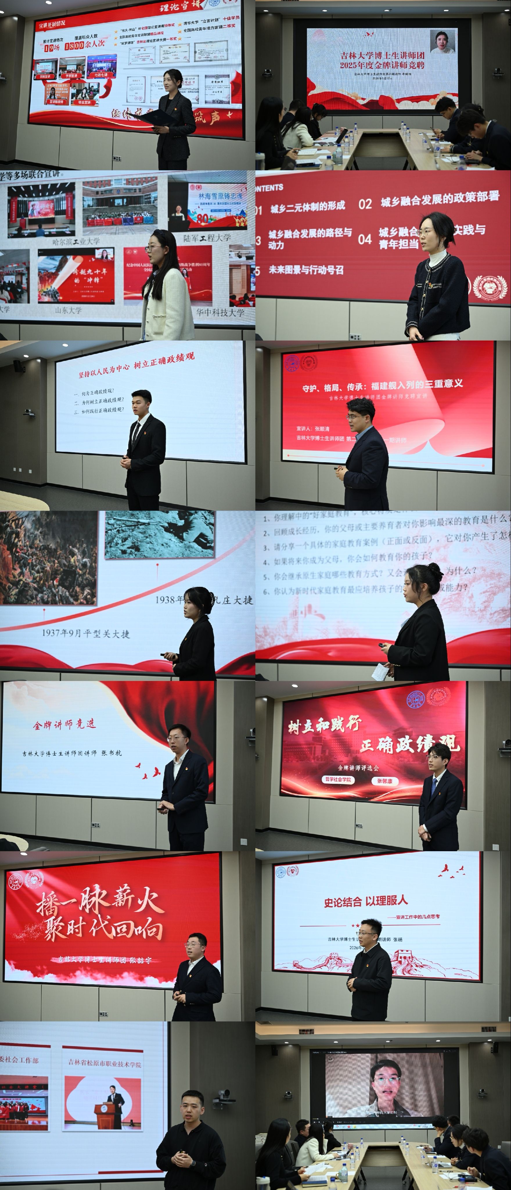 随后,进入“金牌讲师”评选环节。经过前期审核,本次评选共有14位讲师进入最终评审。参评讲师依次进行竞选展示,内容涵盖宣讲经历、宣讲内容等。评审团从政治导向、理论深度、教学设计、课堂互动等方面进行综合评分,整个过程公开透明、严谨规范,充分体现了讲师团对宣讲质量的高度重视。