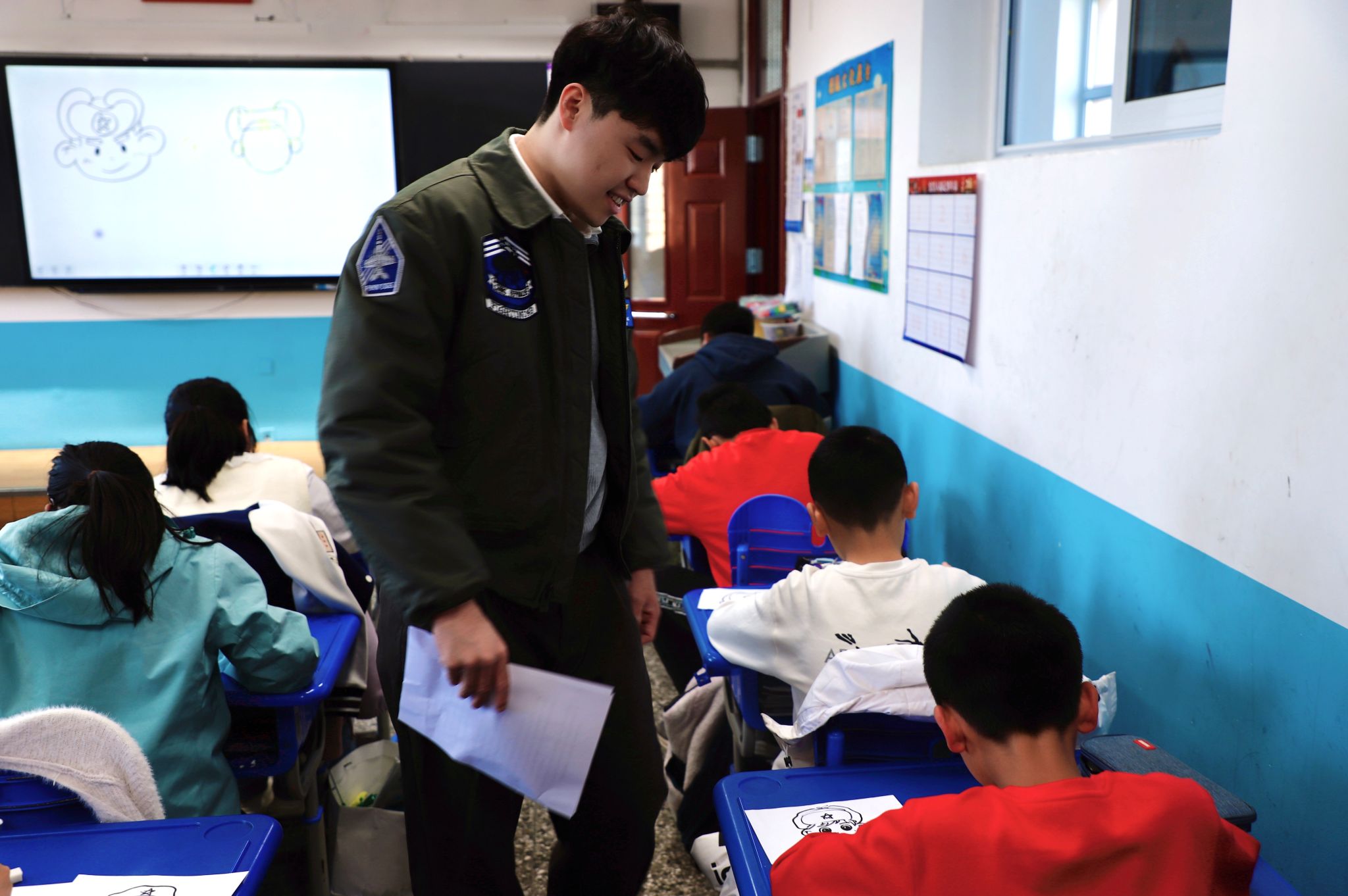 在“点亮童心”互动环节,艺术学院2025级硕士研究生梁家赫精心设计了雷锋简笔画模板与“学雷锋 树新风”艺术字范例。通过PPT演示与现场示范,他耐心讲解绘画技巧与字体结构,指导孩子们完成勾线、涂色及艺术字书写。在分组协作中,每位学生都积极参与、动手实践,用画笔和文字表达对雷锋精神的理解与敬意,让榜样形象在童心中悄然扎根。