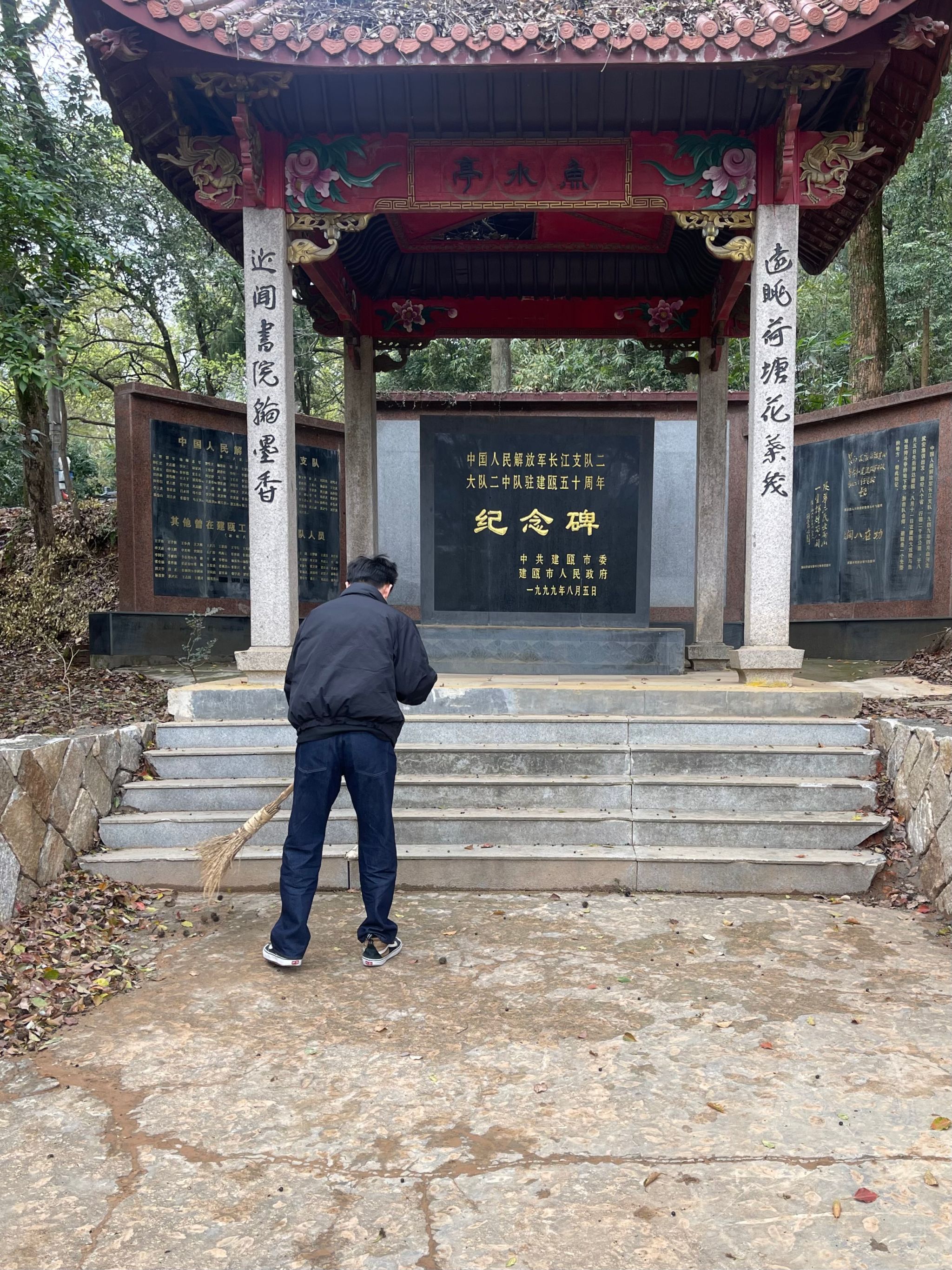 在第63个“学雷锋纪念日”来临之际,我以实际行动践行志愿服务精神,参与了市政园林部门组织的环境清洁工作,负责福建省黄华山革命烈士纪念公园的落叶清扫任务。我的具体服务区域是园内的“长江支队二大队二中队驻建瓯五十周年纪念碑”及军民纪念亭周边。