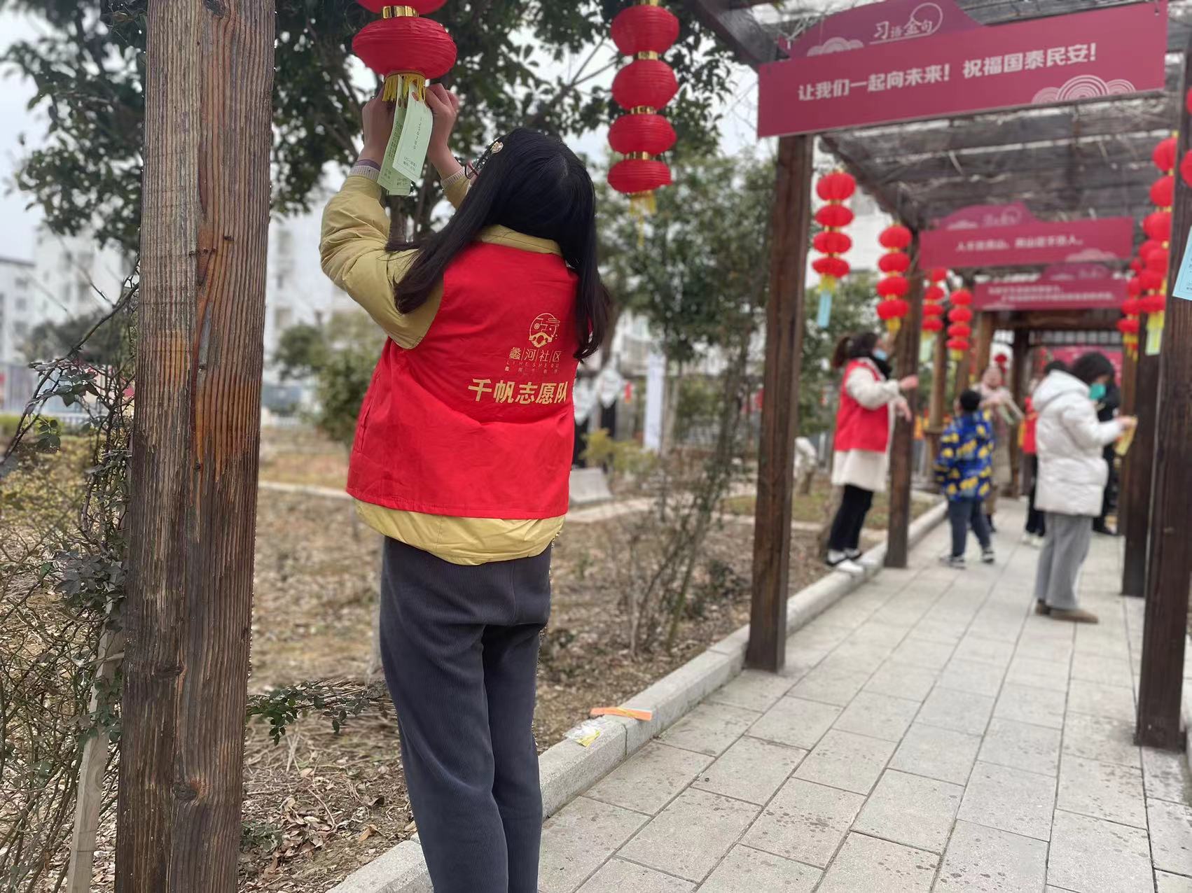 活动当日,春寒料峭,我早早来到现场,身着红马甲迅速投入工作。在服务台前,我耐心引导居民签到登记,细致发放活动材料,认真解答大家关于猜灯谜、兑奖品的各类疑问,桌上的登记表记录下每一次贴心的服务。随后,我又穿梭在灯谜长廊,踮脚将五彩灯谜条悬挂在灯笼下,仔细调整位置,确保居民能清晰辨认。