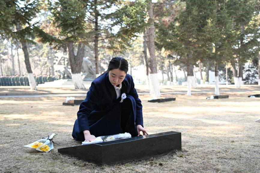 仪式结束后,同学们缓步走向烈士墓区。在苍松翠柏之间,大家仔细擦拭墓碑,敬献鲜花,寄托哀思,致敬英雄。