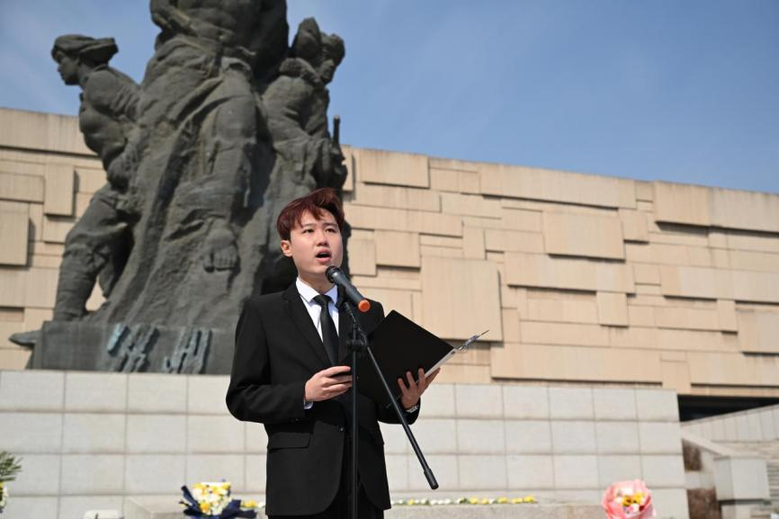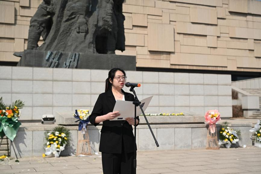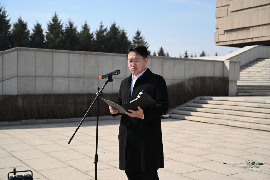 新媒体中心肖凯源同学带来诗朗诵,以铿锵之声追忆峥嵘岁月,抒发对先烈的无限哀思与敬仰。在吴晗同学的领誓下,全体研究生代表庄严宣誓:“赓续红色血脉,铸牢信仰之基;厚植家国情怀,把稳思想之舵;激扬学术风帆,勇攀科学高峰;勇担时代使命,书写青春华章!”誓言铮铮,响彻陵园,彰显了吉大研究生“强国有我”的决心与信仰。