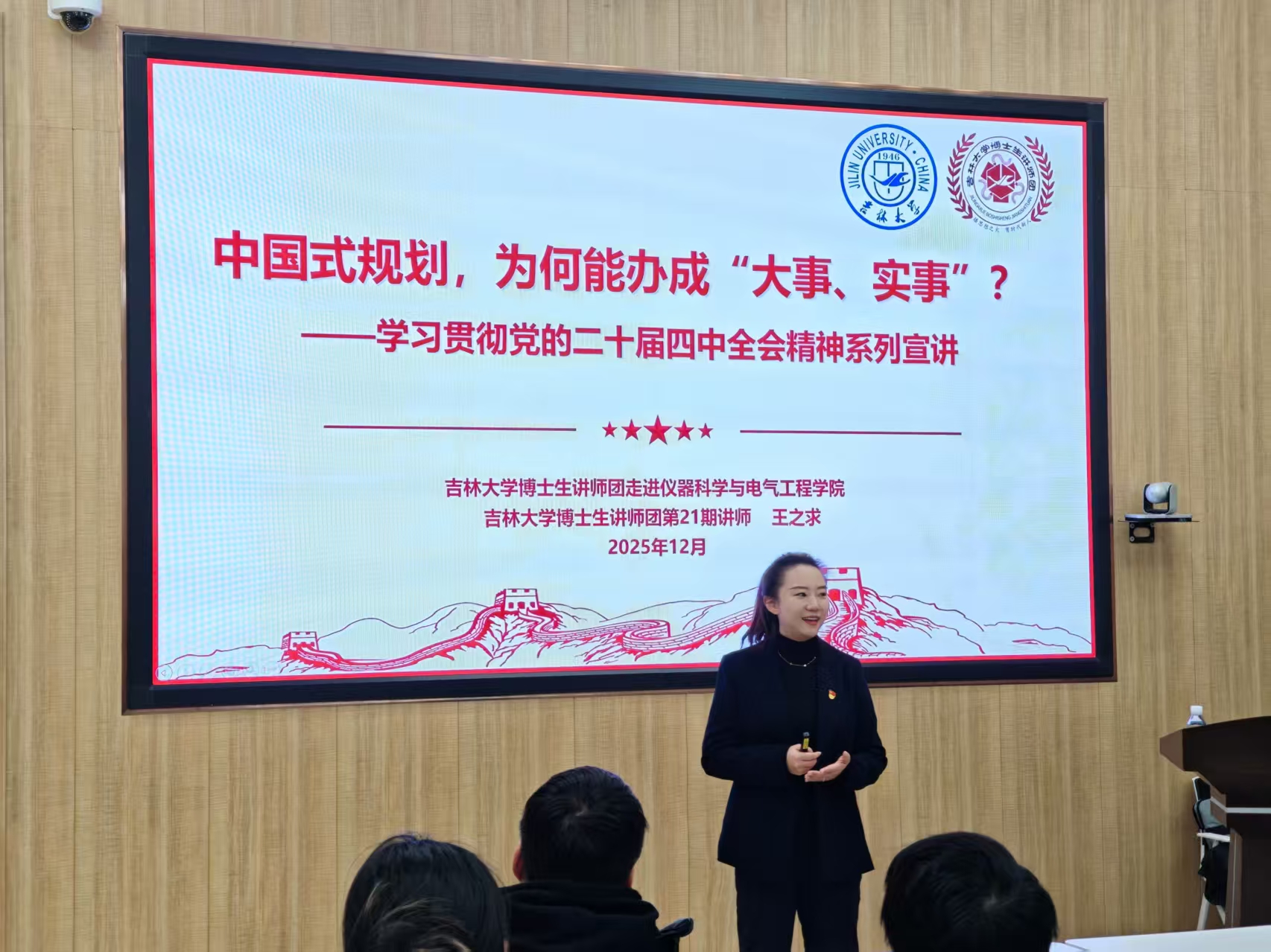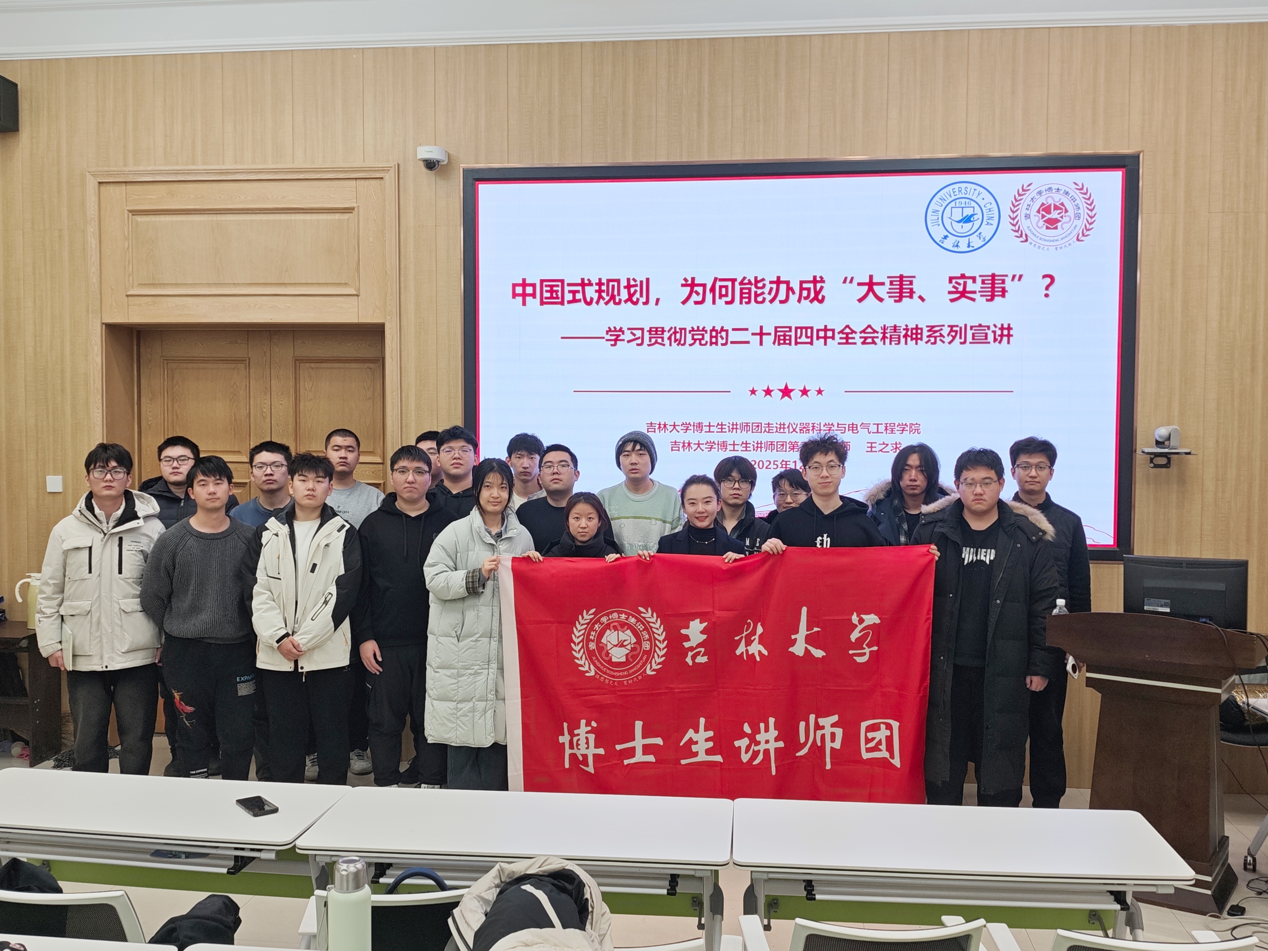 本次宣讲有效帮助同学们系统理解党的二十届四中全会精神,进一步认识到中国式规划的制度优势与实践伟力,明晰了“十五五”规划的战略蓝图与青年担当。在理论阐释与案例分析的双重支撑下,同学们对如何将个人发展融入国家大局、以专业所长服务高质量发展有了更加清晰的思路,对未来科研方向与专业实践形成了更具针对性的规划。吉林大学博士生讲师团将继续深耕理论宣讲、创新传播形式,让党的创新理论直抵青年心灵、落地生根,滋养更多青年走向更广阔的未来。