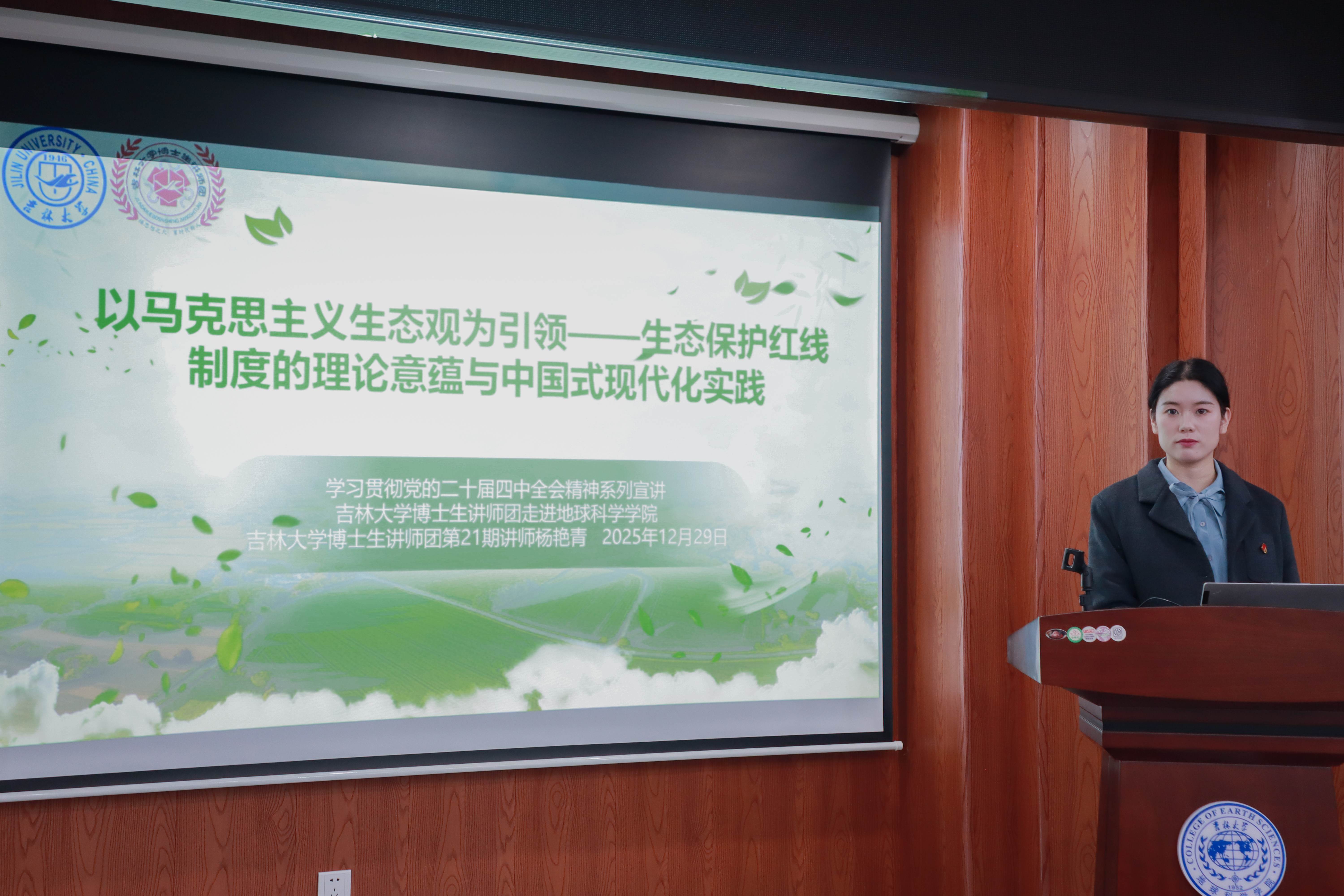 为深入学习贯彻党的二十届四中全会精神,吉林大学党委研究生工作部组织博士生讲师团走进校内各学院,开展党的二十届四中全会精神宣讲系列活动。12月29日,讲师杨艳青在地球科学学院进行了宣讲,地球科学学院研究生代表参与了本次活动。