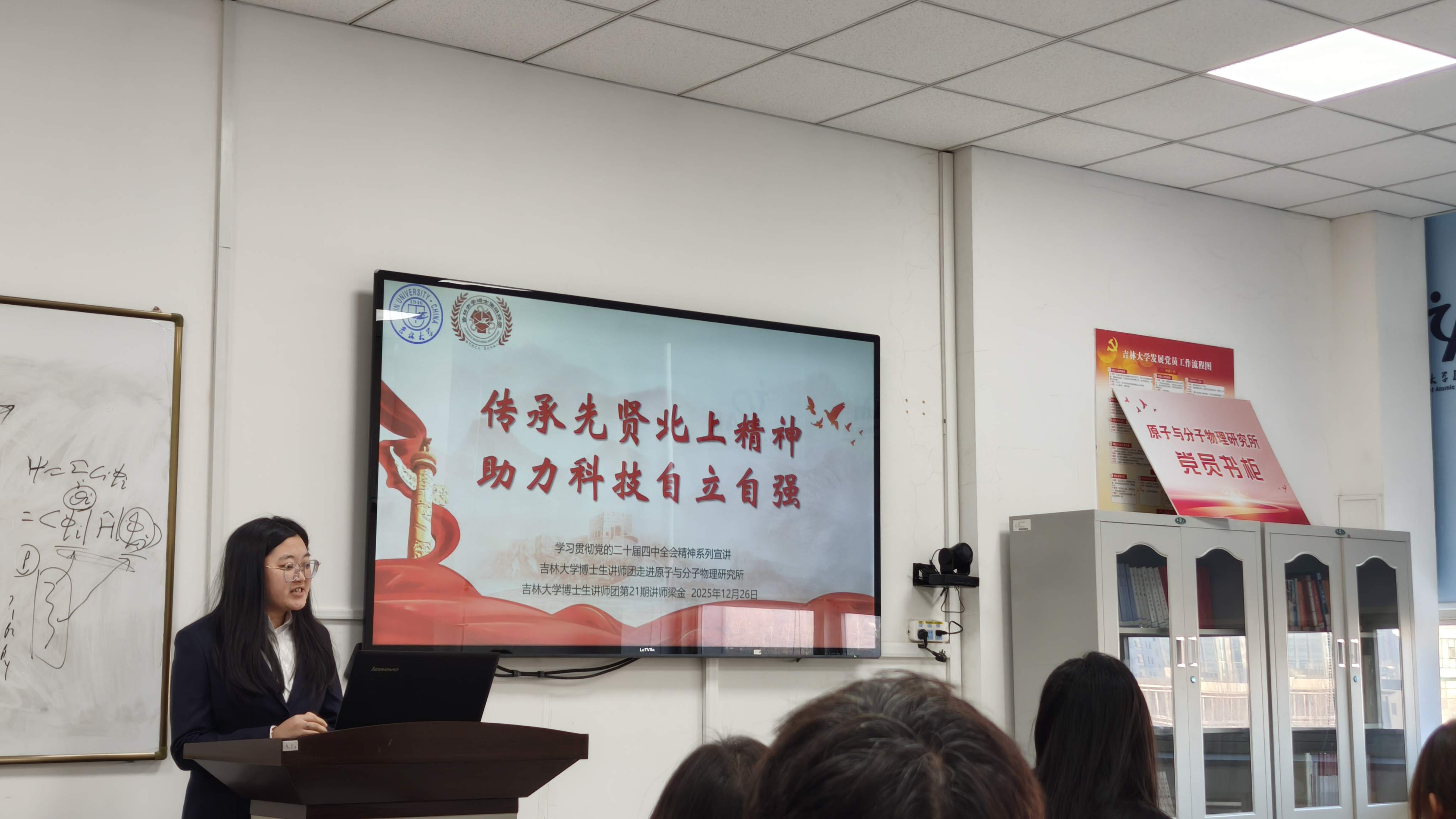 为深入学习贯彻党的二十届四中全会精神,吉林大学党委研究生工作部组织博士生讲师团走进校内各学院,开展党的二十届四中全会精神宣讲系列活动。12月26日,讲师梁金在原子与分子物理研究所532会议室进行了宣讲,原子与分子物理研究所二十余名博士生党员参与了本次活动。